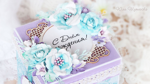 Основа выполнена из белого дизайнерского картона, а каждая стеночка (внешние и внутренние) оформлены дизайнерской бумагой голубого цвета. Крышечка оформлена сиреневым кардстоком . На верхней части крышечки ажурная рамочка, внутри которой надпись "С Днем Рождения!"...