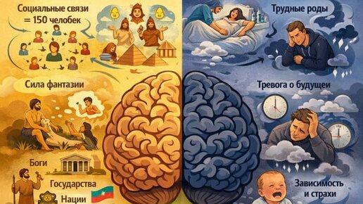 Наш мозг — преимущество или наказание? Если смотреть на человека как на биологический вид, у нас есть два «фишки», которые сделали нас сильнее большинства животных. 1️⃣ Первый — социальность. Наш мозг способен удерживать устойчивые связи примерно с ≈ 150 людьми — это та самая «стая» среднего человека (число Данбара). В природе это огромный бонус: чем лучше кооперация, тем выше шансы выжить. 2️⃣ Второй — фантазия. И вот здесь начинается самое интересное. ❗️Когнитивная революция: 70 тысяч лет назад Примерно 70 тыс...