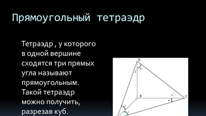 Тетраэдр — простейший многогранник, гранями которого являются четыре треугольника. Тетраэдр является треугольной пирамидой при принятии любой из граней за основание. У тетраэдра 4 грани, 4 вершины и 6 рёбер. Тетраэдр, у которого в одной вершине сходятся 3 прямых угла называют прямоугольным, а противоположный этим 3-м прямым углам 4-ый треугольник (грань) назовём гипотенузным. Прямоугольный тетраэдр – угол между всеми тремя ребрами при одной вершине является прямым, т.е. равным 90° Формула площади...