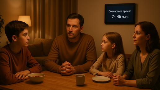 Меньше восьми часов. За целую неделю. И рядом аккуратно подпись: «Это ниже среднего по вашему региону.» Система собрала данные автоматически — из микрофонов, камер, датчиков движения. Она отметила, когда мы обедаем за одним столом, когда кто-то включает телевизор, когда двери в детскую и спальню закрываются почти одновременно...