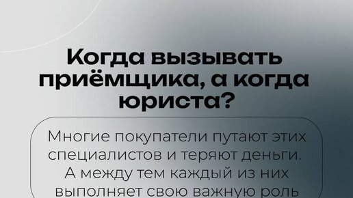 Думаете, что юрист и приёмщик — это одно и то же? Разберёмся за 2 минуты📌 Многие покупатели путают этих специалистов и теряют деньги. А между тем каждый из них выполняет свою важную роль. Юрист по недвижимости защищает ваши интересы в документах. Он проверит: 1️⃣Чистоту сделки 2️⃣Правильность договора 3️⃣Риски при использовании маткапитала 4️⃣Сложности с несколькими собственниками Приёмщик квартиры — ваш эксперт по качеству. Он найдёт: 1️⃣Скрытые дефекты отделки 2️⃣Проблемы с коммуникациями 3️⃣Несоответствия...