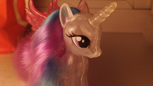 Сегодня мы поговорим о главной правительнице Эквестрии - принцесса Селестии. Имеет высоту 10 см. Аликорн с пурпурными глазами и ДЛИННЫМИ ресницами. Полупрозрачного белого цвета тело и яркие розовые крылья с блёстками и длинный белый силиконовый рог. Трёхцветная грива: бирюзового, розового и сиреневого цвета и однотонный розовый хвост. Знак отличия представлен в виде яркого солнышка на кнопке, при нажатии на которую Селестия светится. Выбитого значка...