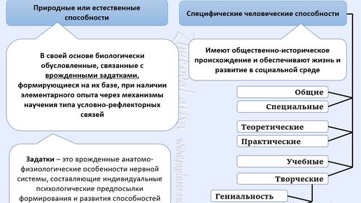 Способности – это такие психологические особенности человека, от которых зависит успешность приобретения знаний, умений и навыков, но которые сами к наличию этих знаний, умений и навыков не сводятся. Способности определяются как индивидуально-психологические особенности человека, которые выражают его готовность к овладению определенными видами деятельности и к их успешному осуществлению. Способности и знания, способности и умения, способности и навыки не тождественны друг другу. По отношению к навыкам, умениям и знаниям способности человека выступают как некоторая возможность...