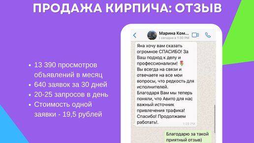 Кейс: продажа кирпича | 640 заявок по 20 рублей с Авито