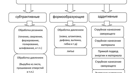 В статье: основные сведения о классификации технологий, о перспективах аддитивных технологий. Для начала рассмотрим, а какие технологии производства деталей или заготовок деталей существуют: 1) Субтрактивные технологии. При использовании этой группы технологий берется заготовка и «отсекается лишнее». Это обработка металлов резанием (обработка режущим инструментом - точение, фрезеровка, сверление и пр., или обработка абразивным инструментов – шлифование, полирование, хонингование, гидроабразивная обработкаи пр...