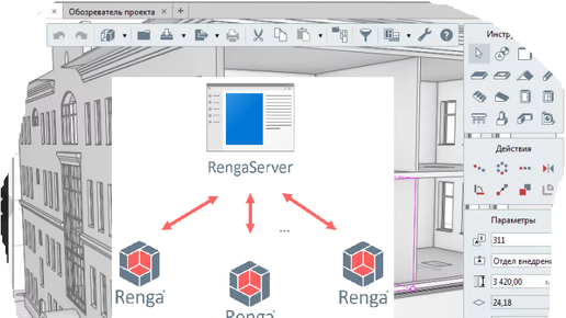 Процесс проектирования вовлекает более одного специалиста, обычно, над созданием проекта работает коллектив. Для этого случая разработчик программы ренга развивает направление совместной работы. Современная версия программы renga поддерживает работу с центральным хранилищем данных (Renga Collaboration Server - организатор совместной работы проектировщиков и других участников проектного процесса - это подключение, хранение, синхронизация и передача данных на сервере). Началом работы над инструментом совместной работы в ренга считается 2019 год...