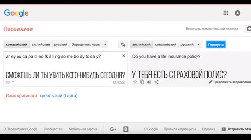 Гугл переводчик часто выручает нас по жизни. Перевести что нибудь по учебе или начать переписку с иностранцем.Однако есть и очень странные вещи у этого сервиса Если попытаться перевести по английски с сомалийского "ты сатана?", то получиться довольно жуткий перевод. Непонятно зачем кому-то в здравом уме вводить такое, многие ответы на наводят на мысль что это искусственный интеллект, который желает смерти человечества. Следящая фраза пугает до смерти. На вопорос "Сможешь ли ты убить какого нибудь сегодня?" он выдаст вам "а утебя есть страховой полис"...