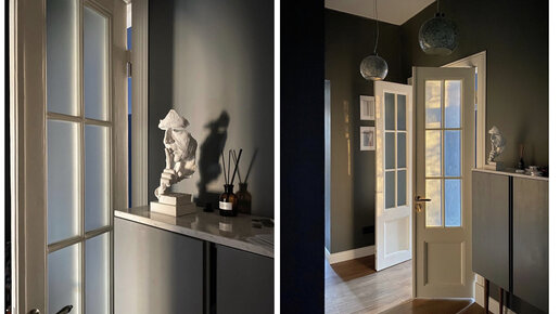 Идея того, как должен выглядеть холл сформировалась к концу 1930-х годов. Передняя – это помещение, связывающее остальные помещения между собой и первое, что видят хозяева и гости, зайдя в квартиру.  Идеальная «передняя-холл» или даже «передняя-гостиная» достаточно просторная. Ее форма стремится к квадрату. Она условно разделена на «чистую» и «грязную» зоны (в грязной зоне встроенный шкаф). Здесь есть столик с местом для телефона, зеркало, пара стульев или кресел. Хозяйственные помещения (кухня, санузел) вынесены вглубь квартиры и скрыты от глаз гостей...