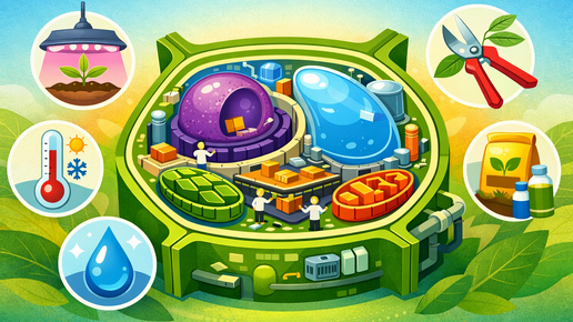 Полное руководство для сити-фермеров: от теории клеточного строения к практике выращивания здоровых растений на подоконнике, балконе и городской ферме. Каждый, кто выращивает растения, рано или поздно сталкивается с загадками: рассада вытягивается, листья желтеют, плоды не наливаются вкусом, а салат перестаёт быть хрустящим через час после срезки. Советы «полейте» или «добавьте удобрений» понимания не добавляют, потому что они не касаются главного — того, что происходит внутри растения, на клеточном уровне...
