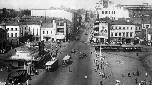 Мы продолжаем нашу рубрику "разглядываем старые фотографии" и сегодня рассмотрим фотографию Пушкинской площади, до 1931 года называвшейся Страстной по одноимённому монастырю. Это фотография 1934 года, снятая Наумом Грановским с углового дома с круглой башней, который стоит на Пушкинской площади и сейчас. Улица Горького (Тверской она была до 1932 года), ещё узкая, метров 17 шириной. Через несколько лет после того, как была сделана эта фотография, почти всю левую сторону улицы снесли для расширения по сталинскому генплану...