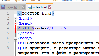 Если вы внимательно рассматривали тэги в своей html-странице, то вероятно видели этот тэг: <title>index</title>. Он расположен внутри тэга <head><title>index</title></head> - так то-же можно писать. Тэг <title>index</title> - это название html-страницы. И отображается это название на вкладке браузера...