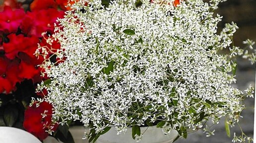 Меня часто спрашивают, какие неприхотливые растения подойдут не только для открытого грунта, но и контейнерного выращивания? И чем можно разнообразить и подчеркнуть красоту ампельных цветов? Сегодня речь пойдет как раз о такой культуре. Это растение можно считать настоящей находкой для каждого, даже начинающего цветовода. Оно очень простое в уходе и универсальное. К тому же радует долгим цветением и видом своих роскошных пышных соцветий, похожих на невесомые облака или воздушную пену. Называется Молочай гибридный или Эуфорбия/Euphorbia hypericifolia...