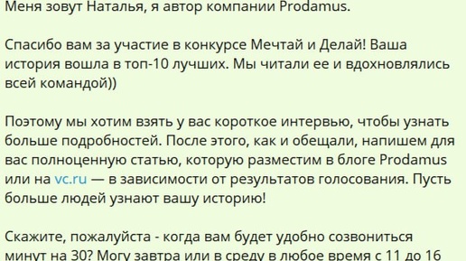 Попытка — не пытка, а если — да! 🚪  Знаете, я всегда стараюсь открывать двери, где они есть. В прямом и переносном смысле. Кто знает, куда они могут привести?  Поэтому, когда компания «Продамус» объявила конкурс на лучшую бизнес-историю, я почти не раздумывала. Просто подала заявку. Рука, конечно, дрогнула над кнопкой «отправить»: «А вдруг моя история покажется неинтересной? А вдруг я зря время трачу?»  Но я вспомнила свое же правило — и нажала.  И вот  — результат! Я вошла в ТОП-10 по количеству голосов! 🎉  Это не первое место, скажете вы? Возможно...