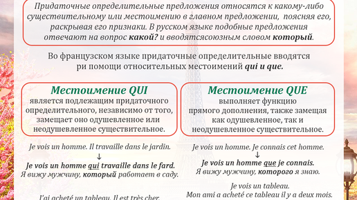 В каких случаях мы используем qui, а в каких que? QUI — заменяет подлежащее (кто/который выполняет действие) QUE — заменяет прямое дополнение (кого/что/который испытывает действие на себе) C’est la chambre ___ coûte 600 euros...