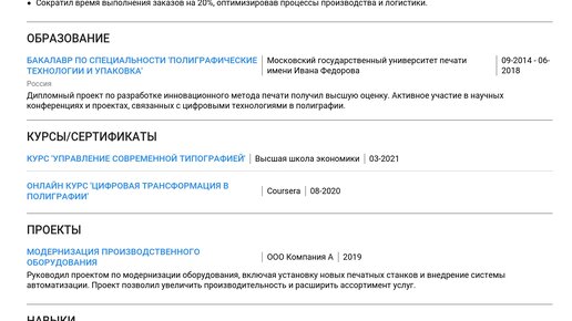 ✨ Пример резюме директора типографии — это ваш ориентир для грамотного и убедительного описания своего профессионального пути. Изучив готовые примеры, вы сможете создать максимально эффективное резюме, которое приведет вас к новой престижной работе. В этом материале вы найдете готовые примеры резюме, актуальные как для начинающих, так и для опытных директоров типографии, учитывающие современные требования работодателей. Мы предлагаем пошаговые инструкции по созданию каждого раздела вашего документа: Изучив пример, вы сможете создать идеальное резюме с помощью нашего конструктора резюме...