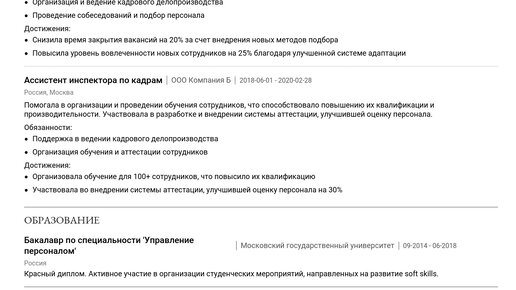 Пример резюме инспектора по кадрам 2025 - Как составить