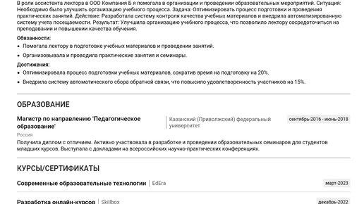 Создать сильное пример резюме лектора — ваш первый шаг к успешному трудоустройству. Изучение готовых примеров поможет составить документ, который выделит вас среди кандидатов и приведет к желаемой работе. В этой статье мы собрали готовые примеры резюме для начинающих и опытных специалистов, а также подробные пошаговые инструкции по составлению каждого раздела: . Вы узнаете, как составить эффективное резюме, учитывая специфику сферы и ожидания HR-менеджеров. Изучив пример, вы сможете создать резюме с помощью нашего конструктора резюме...