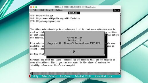 Есть текстовые редакторы, которые дожили до наших дней благодаря необычным фишкам или ностальгии пользователей, а чаще — и тому, и другому. Мне стало интересно, каково это — на практике вернуться к таким ретро-программам. Для эксперимента я выбрал EDIT из ранних MS-DOS и попытался поработать в нем как в обычном редакторе. MS-DOS — операционная система, которая была стандартом для IBM-совместимых ПК еще до того, как Windows стал всемогущим. С версии 5.0 (1991 год) EDIT стал встроенным редактором MS-DOS — кстати, основан он был на QBasic...