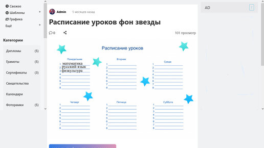 В этой статье расскажем как создать расписание уроков для школьников, на нашем сервисе бесплатно онлайн. Выберите нужный раздел с шаблонами расписаний уроков. И нажмите на понравившийся вам шаблон с расписанием. В шаблоне с расписанием уроков перейдите в редактор нажатием кнопки "Создать макет на основе этого"...