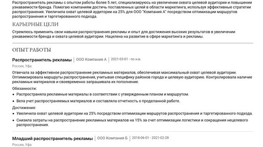 Наш пример резюме распространителя рекламы поможет вам понять, как составить документ, который привлечет внимание работодателя. Используйте его как основу для создания собственного эффективного резюме и быстрого трудоустройства. На этой странице вы найдете готовые примеры резюме распространителя рекламы для начинающих и опытных специалистов. Мы даем пошаговые инструкции по каждому разделу, чтобы помочь вам правильно составить: Узнайте, как учесть актуальные требования работодателей и успешно адаптировать документ под конкретную вакансию...