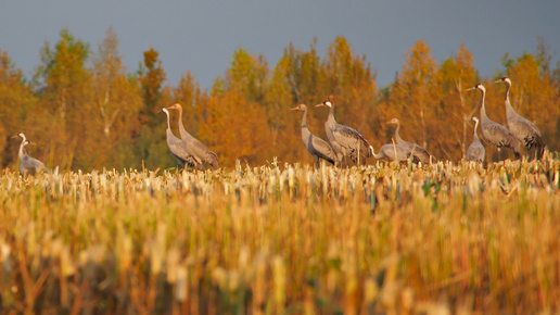 Свой рассказ о повторной поездке на поиски журавлей прервал на том, что добрался до того места, где нахождение журавлей было весьма вероятным. Это скошенные кукурузные поля. Я услышал крики журавлей и направился в ту сторону. Двигался по краю поля, журавли кричали громко, что говорило об их близости. И тут в окно машины неожиданно их увидел. Были они совсем рядом, машину заметили и насторожились. Чтобы не вспугнуть, фотографировал прямо через опущенное стекло. Журавли вели себя достаточно спокойно...