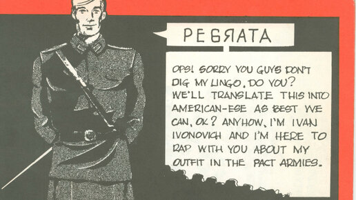 Сегодня мы с Вами рассмотрим интересную памятку для американских солдат, которая вкратце рассказывает про основные виды вооружения стран Варшавского договора. Под каждым фото - перевод. Ссылку на документ я оставлю в комментариях! Ребята! Извините вы не понимаете мой язык, хорошо я переведу это на американский лад, а там как получится. О'кей? Вобщем я Иван Иванович ,и я здесь Для того чтобы рассказать вам о вооружении армии Варшавского договора. Наш взвод считается хорошим сочетанием автоматического и противотанкового оружия...