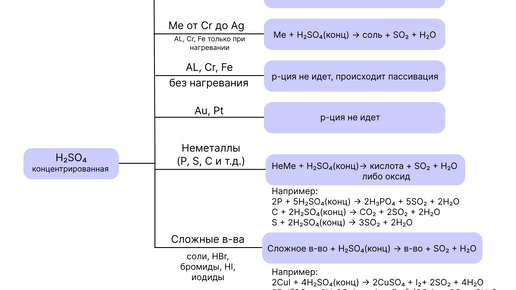 Me + H₂SO₄(конц) → соль + H₂S + H₂O 2. Реагирует с металлами от Cr до Ag ❗Al, Cr, Fe только при нагревании❗ Me + H₂SO₄(конц) → соль + SO₂ + H₂O 3. Не реагирует с Al, Cr, Fe при нормальных условиях (без нагревания)...