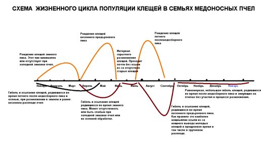 Говоря о жизненном цикле популяции клещей нужно понимать, что эти живые существа не являются самостоятельной частью живой Природы, а паразитируют на пчелах и поэтому их жизнь и циклы развития теснейшим образом связаны с жизнью и развитием пчел. Учитывая все это, мы можем утверждать, что в жизни клещей есть три основных пика воспроизводства с интервалами большего или меньшего снижения репродуктивной активности между ними. Первый пик - это зимний пик размножения. Время на которое приходится этот пик - январь, февраль и март...