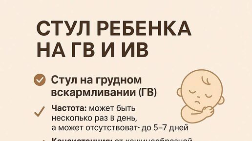 Стул ребёнка на ГВ и ИВ💩 Тема детских 💩остаётся актуальной всегда! Мамы волнуются, если стул вдруг меняется: стал другого цвета, появился запах или слизь. Давайте разберёмся, какой стул может быть нормой, а что должно насторожить. 💡Стул на грудном вскармливании (ГВ) Если ребёнок получает только грудное молоко (без смеси, прикорма, лекарств): ➡️Частота: может быть несколько раз в день, а может отсутствовать до 5–7 дней — при условии, что малыш спокоен, живот мягкий, общее самочувствие хорошее...
