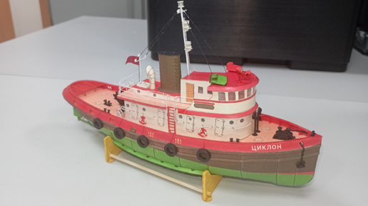 Нашел развёртку американского морского буксира "Despatch 9" в масштабе 1/100. Слегонца погрузившись в интернет было выяснено, что его самоходом в 1947 перегнали из Нью-Йорка в Одессу. Переименовали в "Циклон". И... Оказывается именно он снимался в фильме "Берегите женщин". Вот это поворот! И вот тут мне всерьёз захотелось его собрать. Но для полного счастья нужно переписать название на носу заменив его на "Циклон", что я и сделал. Распечатал, как обычно в фотосалоне на матовой бумаге А4 220г/м. Каркас классический...