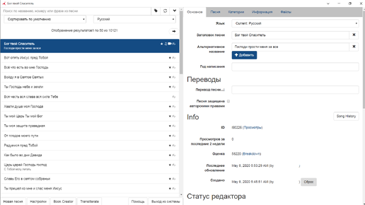 Ссылка для входа в редактор: https://editor.worshipleaderapp.com/ Это отдельное веб-приложение предназначенно для удаленной работы с песенной базой данных. Для подключения, вам необходима учетная запись (аккаунт). Чтобы получить ее нужно обратиться к старшему редактору вашего языка или разработчику приложения. Работать лучше на компьютере или ноутбуке, так как с телефона неудобно. Если в беседе с другим редактором нужно сослаться на какую то песню указывать название не обязательно. Индексация...