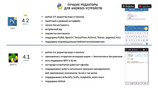 Ссылки для скачивания. Pydroid3: https://play.google.com/store/apps/details?id=ru.iiec.pydroid3&hl=ru&gl=US Qpython 3L: https://play.google.com/store/apps/details?id=org.qpython.qpy3&hl=ru&gl=US #питон...