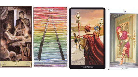 Привет всем любителям таро и просто желающим приобщиться к тайнам! Когда в руки попадает новая колода, хочется сразу начать с ней работать и не терять время на теоретическое изучение. К счастью, таро подчинено системе и несмотря на обилие разнообразных колод, можно найти базовые моменты в большинстве колод. Если посмотреть на картинку ниже, то видно, что на всех картах прослеживается момент двойственности и выбора, направленного в будущее. (В качестве примера приведены карты из темной колоды...