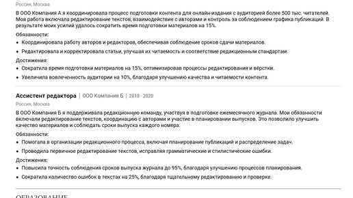 На этой странице вы найдете актуальный пример резюме помощника редактора, который поможет вам разобраться в ключевых требованиях к этой должности. Изучение готового примера — самый быстрый путь к созданию собственного эффективного резюме, способного привести вас на собеседование и получить желаемую работу. 🚀 В нашей статье представлено детальное пошаговое руководство по составлению каждого раздела резюме помощника редактора. Мы охватываем все: от правильного оформления контактов до грамотного описания опыта и навыков, включая специфику требований работодателей...