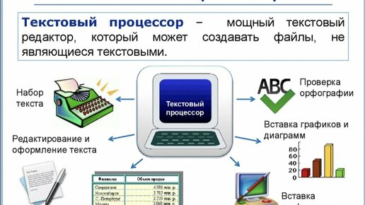 Текстовый процессор - текст редактор с дополнительными возможностями, изменение внешнего вида текста. Текстовые форматы: Редактирование - это изменение содержания документа. К операциям редактирования относятся следующие действия: набор текста; исправление опечаток; копирование, перестановка, удаление частей текста; вставка таблиц, графических объектов, формул и других информационных объектов. Форматирование - процесс изменения оформления текста, внешнего вида документа...