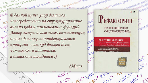 Упор делается непосредственно на структурирование, анализ кода и наименование функций. Автор затрагивает тему оптимизации, но в любом случае придерживается принципа - ваш код должен быть читаемым и понятным, а остальное наладится :)