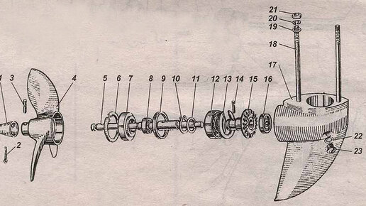 Начну с того, как выглядит редуктор из внутри. 1) Колпачок 2) Шплинт 3x25 3) Штифт 4) Винт гребной в сборе 5) Вал горизонтальный 6) Кольцо стопорное 7) Стакан сальника 8) Сальник 9) Кольцо уплотнительное 10) Кольцо стопорное 11) Шайба-компенсатор 12) Подшипник 205 13) Шайба регулировочная 14) Штифт 15) Шестерня ведомая 16) Подшипник 201 17) Корпус редуктора 18) Шпилька 19) Шайба 8 20) Шайба пружинная 8 21) Гайка М8 22) Прокладка 23) Пробка Здесь я опишу те элементы что относятся не посредственно к редуктору...