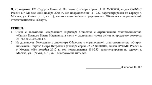 Как написать решение единственного участника ООО о смене директора. Пример для 2021 года
