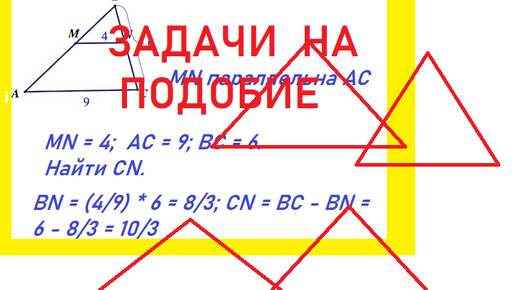Через точки М и N, принадлежащие сторонам АВ и ВС треугольника ABC соответственно, проведена прямая МN, параллельная стороне АС. Найдите длину СN, если ВС = 6, МN = 4 и АС = 9.