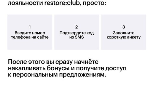 restore:club — это бонусы, скидки и подарки, которые растут с каждой покупкой. Чем больше покупок — тем выше уровень и больше привилегий. В карточках — о каждом уровне и о том, как стать участником клуба...