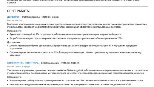 Пример резюме директора строительной компании 2025 - Готовые примеры