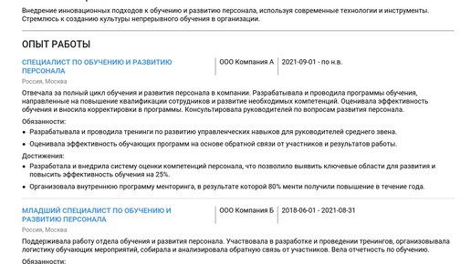 Пример резюме специалиста по обучению и развитию персонала 2025 - Советы