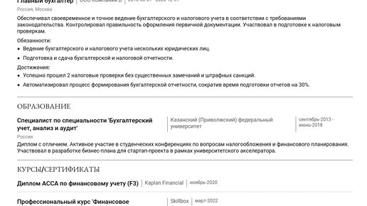 Пример резюме финансового директора с функцией главного бухгалтера 2025