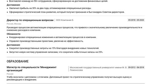 💡 Пример резюме генерального директора поможет вам увидеть, как составить документ, который выделит вас среди других кандидатов. Изучение готовых примеров — ваш прямой путь к получению желаемой должности. Заголовок резюме — это первое, что видит рекрутер, поэтому он должен быть четким, профессиональным и отражать вашу специализацию. Для профессии "генеральный директор" важно указать не только должность, но и уровень ответственности, если это уместно. ✅ ❌ Контактная информация должна быть полной, актуальной и профессионально оформленной...
