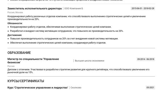 Изучите наш пример резюме исполнительного директора, чтобы понять, как создать документ, который выделит вас среди конкурентов. Эффективное резюме — ваш первый шаг к получению желаемой позиции. Здесь собраны готовые примеры резюме исполнительного директора и пошаговые инструкции, которые помогут вам создать сильный документ, соответствующий требованиям работодателей. Вы найдете подробные советы по каждому разделу: Изучив пример, вы сможете создать резюме с помощью нашего конструктора резюме, независимо от вашего текущего уровня опыта...