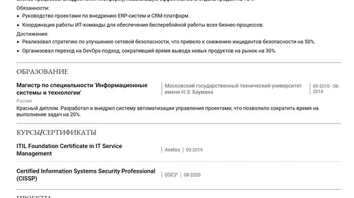 Пример резюме IT директора поможет увидеть, как выглядит действительно эффективный документ. Изучение готовых примеров — лучший способ составить сильное резюме, которое приведет к желаемой работе. 🚀 На этой странице мы показываем пример резюме IT директора и рассказываем, как составить свой идеальный документ, подходящий под актуальные требования работодателей. Вы найдете готовые примеры для специалистов разного уровня и подробные пошаговые инструкции для каждого раздела, от контактов до навыков:...