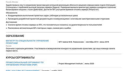 Пример резюме руководителя-менеджера проекта — это ваш первый шаг к созданию сильного документа. Изучение готовых примеров помогает понять, как составить эффективное резюме, чтобы быстро получить желаемую работу. На этой странице представлено подробное руководство по составлению резюме руководителя проекта с нуля. Вы найдете: Мы даем ценные советы как для начинающих специалистов, так и для опытных руководителей. Изучив пример, вы сможете создать резюме с помощью нашего конструктора резюме. Заголовок резюме должен быть четким, конкретным и отражать вашу специализацию...