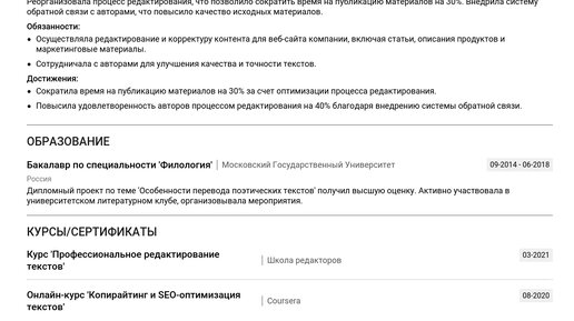 Изучите наш пример резюме редактора текстов, чтобы научиться составлять действительно эффективное CV. Используйте готовые, проверенные решения для увеличения шансов быстро получить желанную работу. В этой статье мы предлагаем подробный готовый пример резюме для редактора текстов, дополненный пошаговыми инструкциями по заполнению каждого раздела. Вы найдете советы как для начинающих специалистов без опыта, так и для опытных профессионалов, а также узнаете: Изучив пример, вы сможете создать идеальное резюме с помощью нашего конструктора резюме...