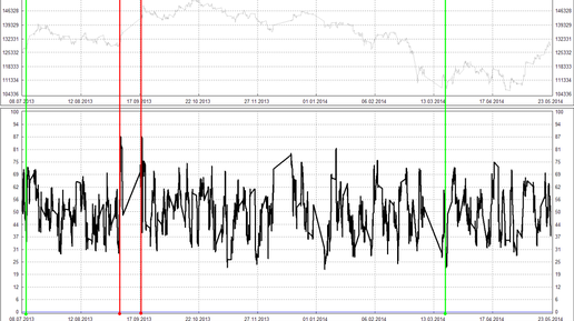 90% стратегий на RSI/MA сливают депозит после комиссий. Почему? Построим простую стратегию – если RSI больше 70, то цена с большей вероятностью развернётся, открываем шорт, когда RSI вернётся в зону меньше 70 – закрываем шорт. Когда RSI меньше 30, открываем лонг, когда возвращается в зону больше 30 – закрываем лонг. Рассмотрим не абстрактный случайный процесс, а существующую историю Ri. На примере индикатора RSI. Если посмотреть график движения цены и его RSI, то видно, что иногда этот индикатор хорошо прогнозирует разворот цены, а иногда плохо...