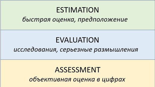 В данной статье разберём отличие слов синонимов Assessment, Evaluation и Estimation. Переводятся они как "оценка, оценивать" Evaluation - "оценка, оценивание"- это процесс наблюдения и измерения вещи с целью определения ее ценности, данный процесс может занять некоторое время и, вероятно, потребует исследований или серьезных размышлений. Ценность может быть определена путем сравнения ее с аналогичной вещью, либо с неким стандартом. К примеру мы можем провести оценку преподавания путем вынесения суждения о нем в рамках административного процесса...